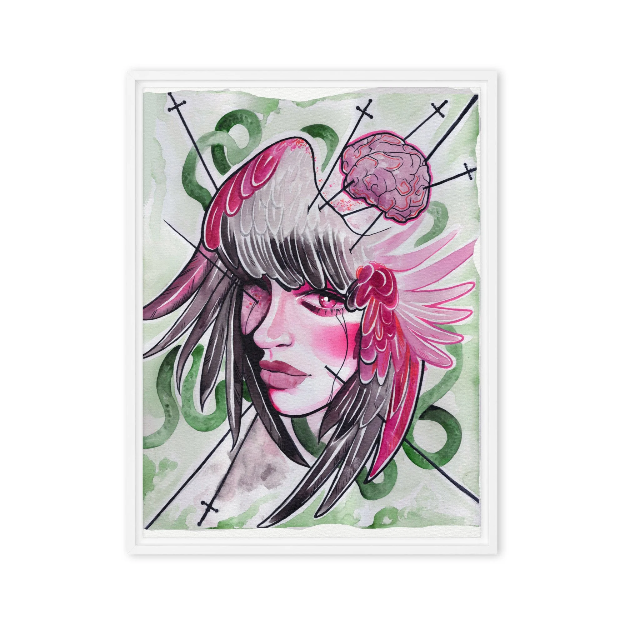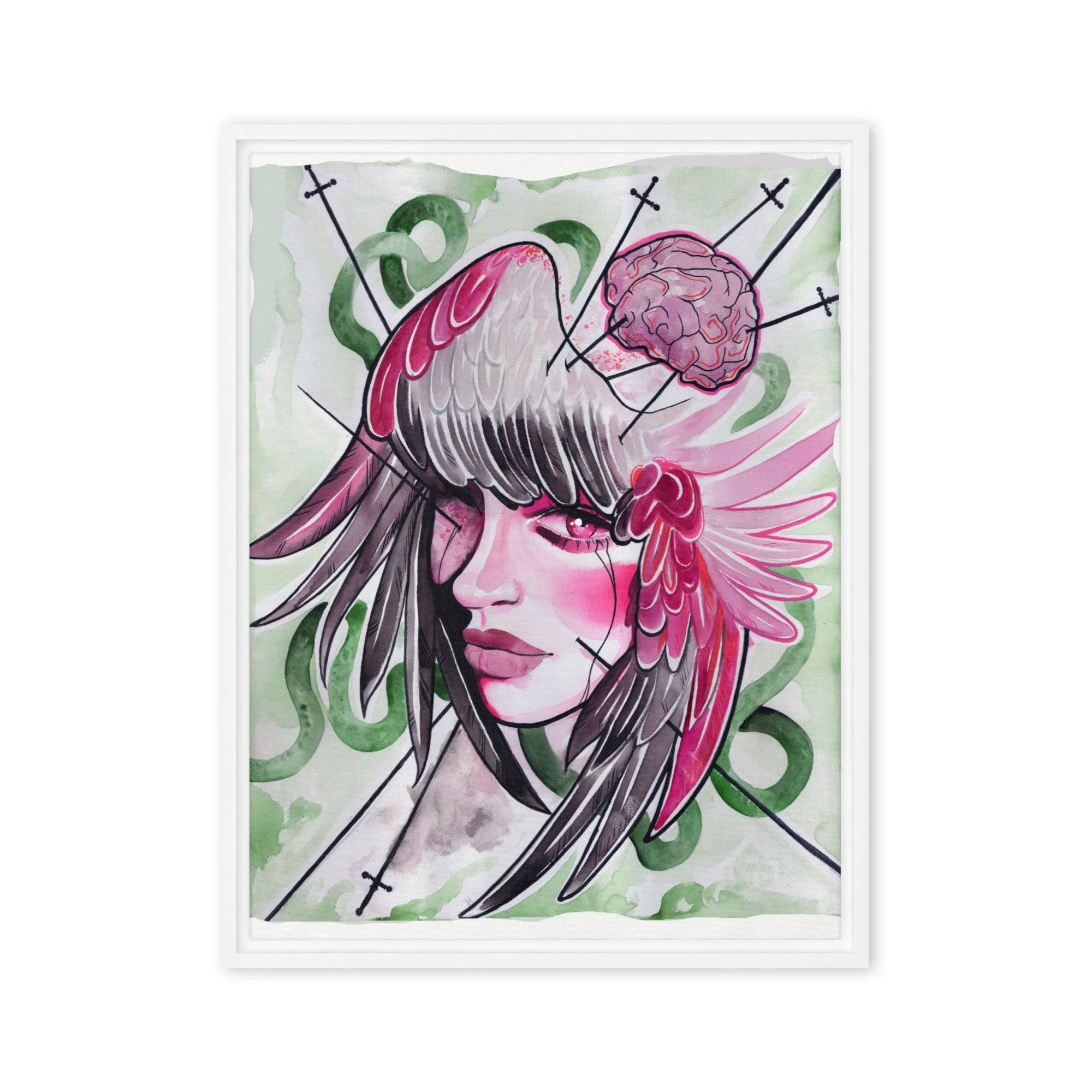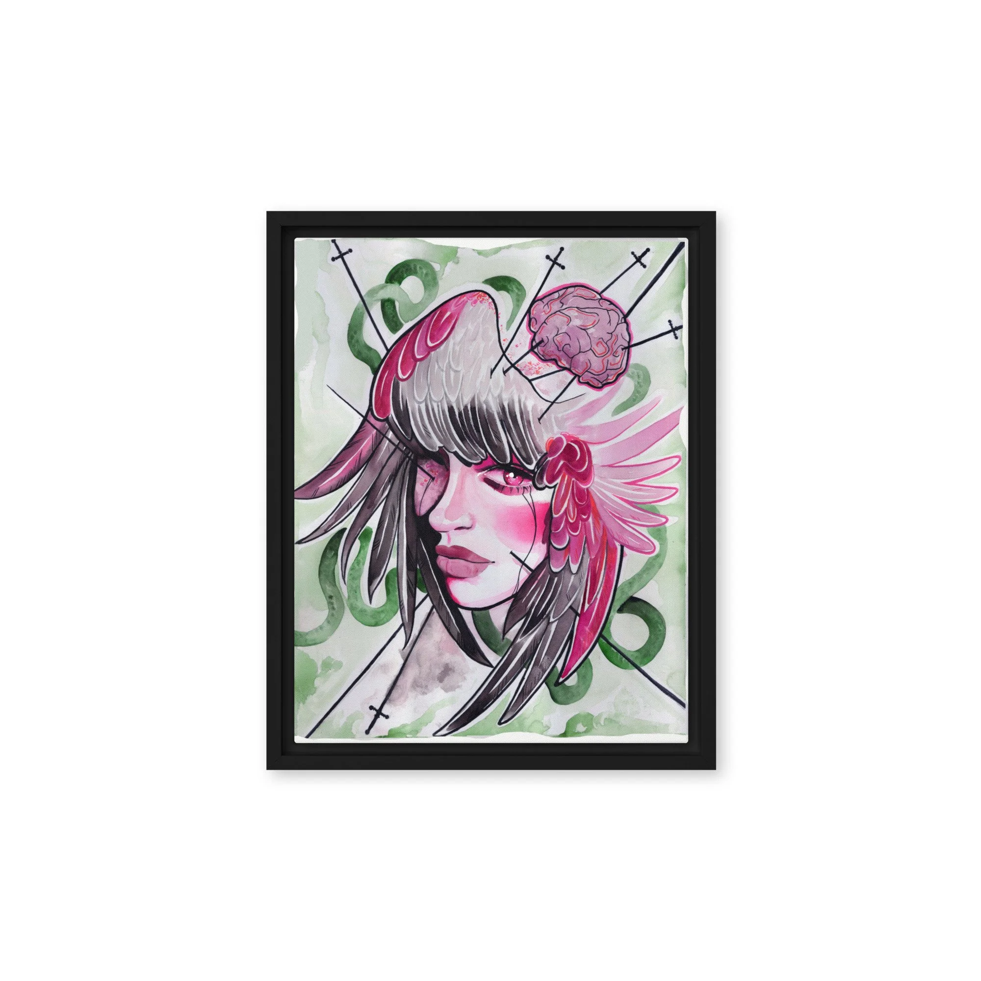 - The framed canvases with brown and black frames have a black inside around the canvas, and the canvases with white frames have a white inside around the canvas.