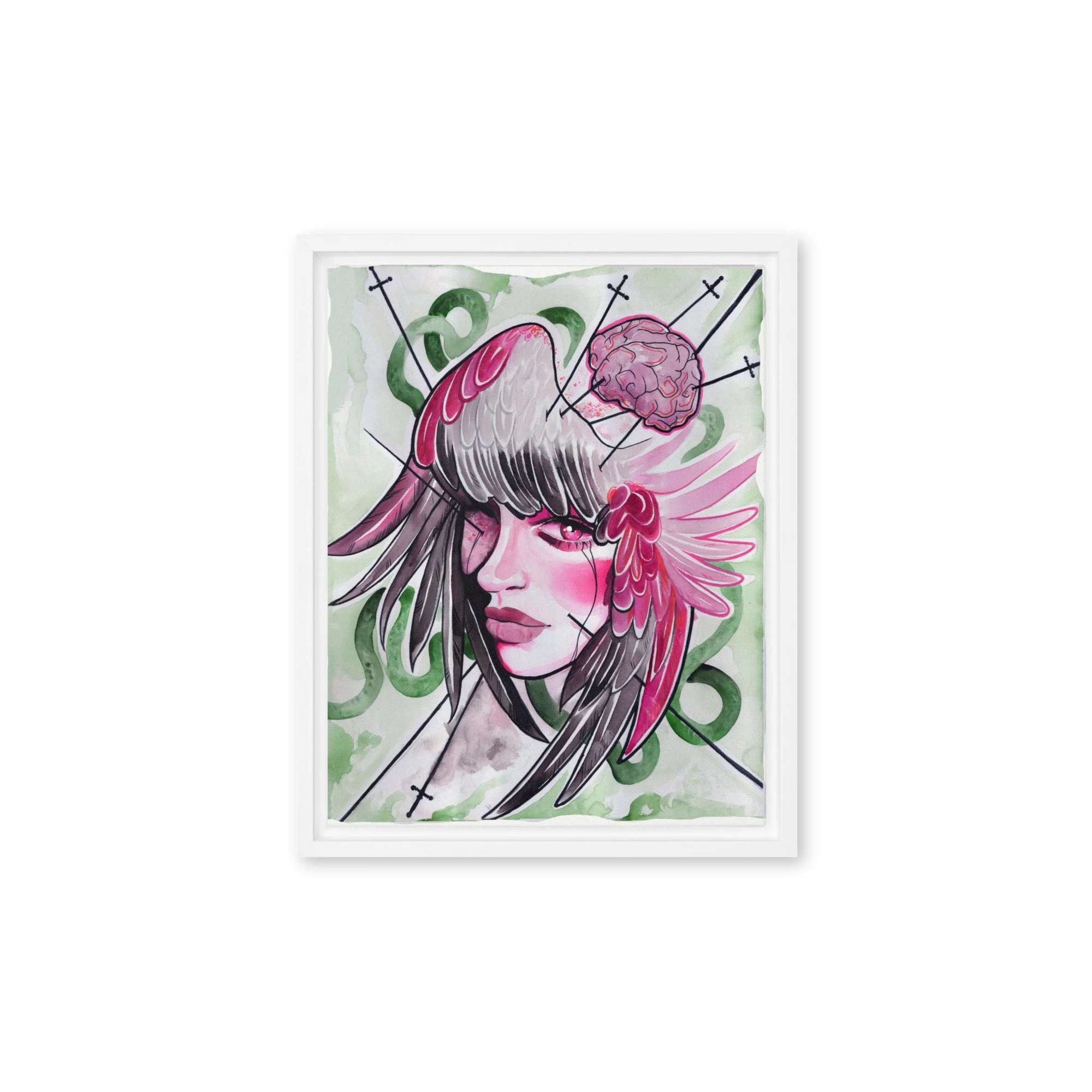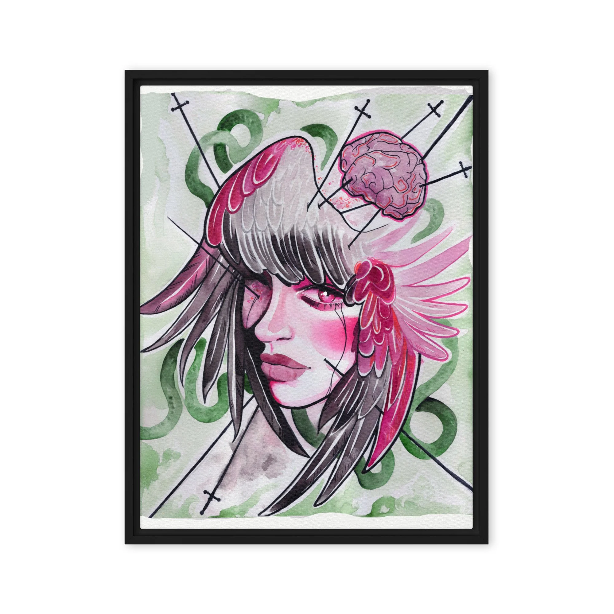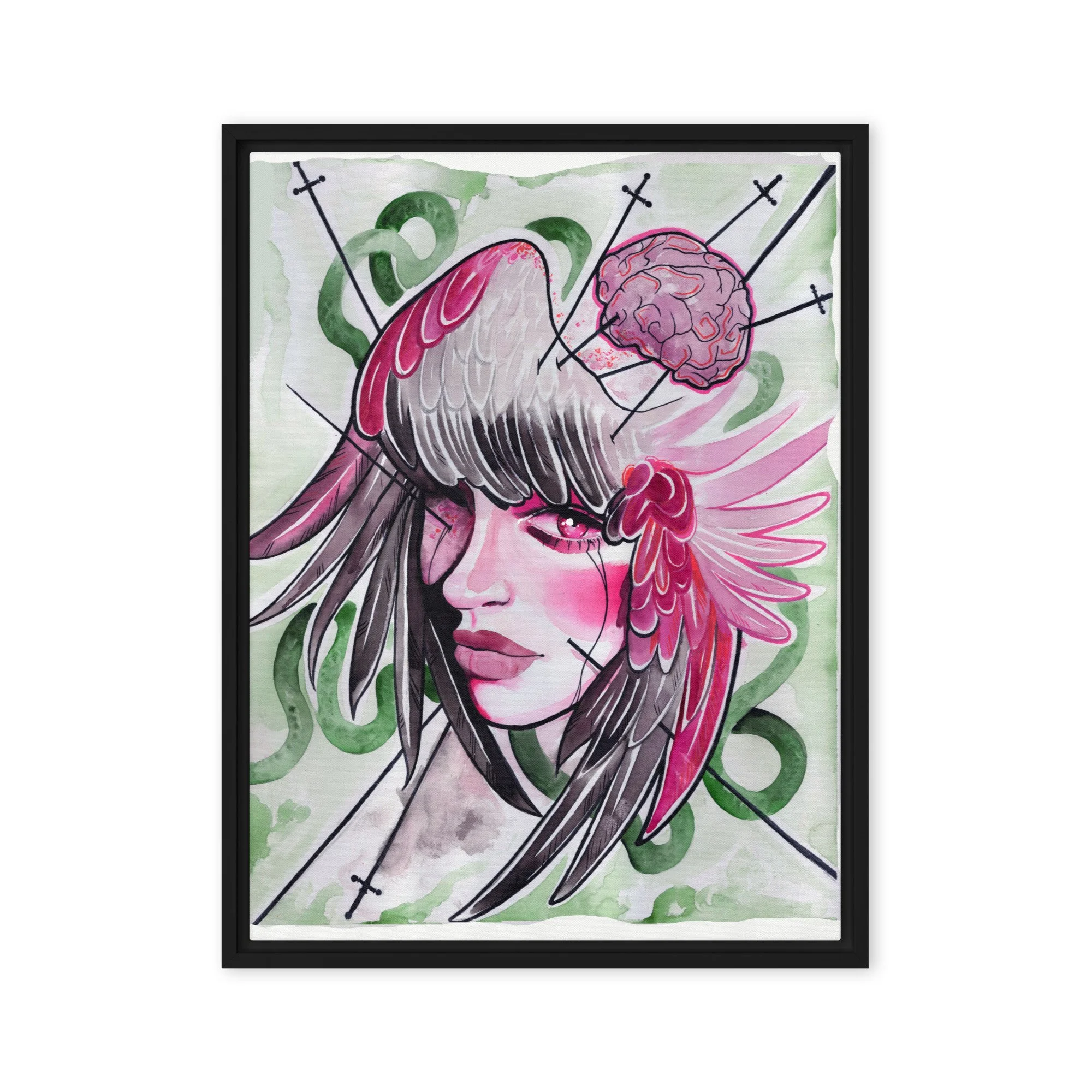 - The framed canvases with brown and black frames have a black inside around the canvas, and the canvases with white frames have a white inside around the canvas.